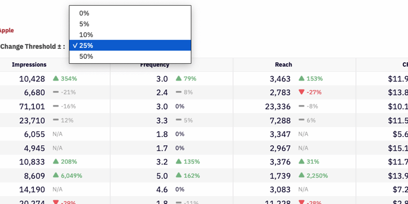 Another improvement was the addition of the ’Change Threshold‘ percentage dropdown. Instead of always displaying the percentage change in red or green, I proposed a “buffer percentage” that would be displayed as flat (or no change). Some users told me they only cared about large ups or downs… while others told me they wanted to see red or green every time. This solution accommodated both.